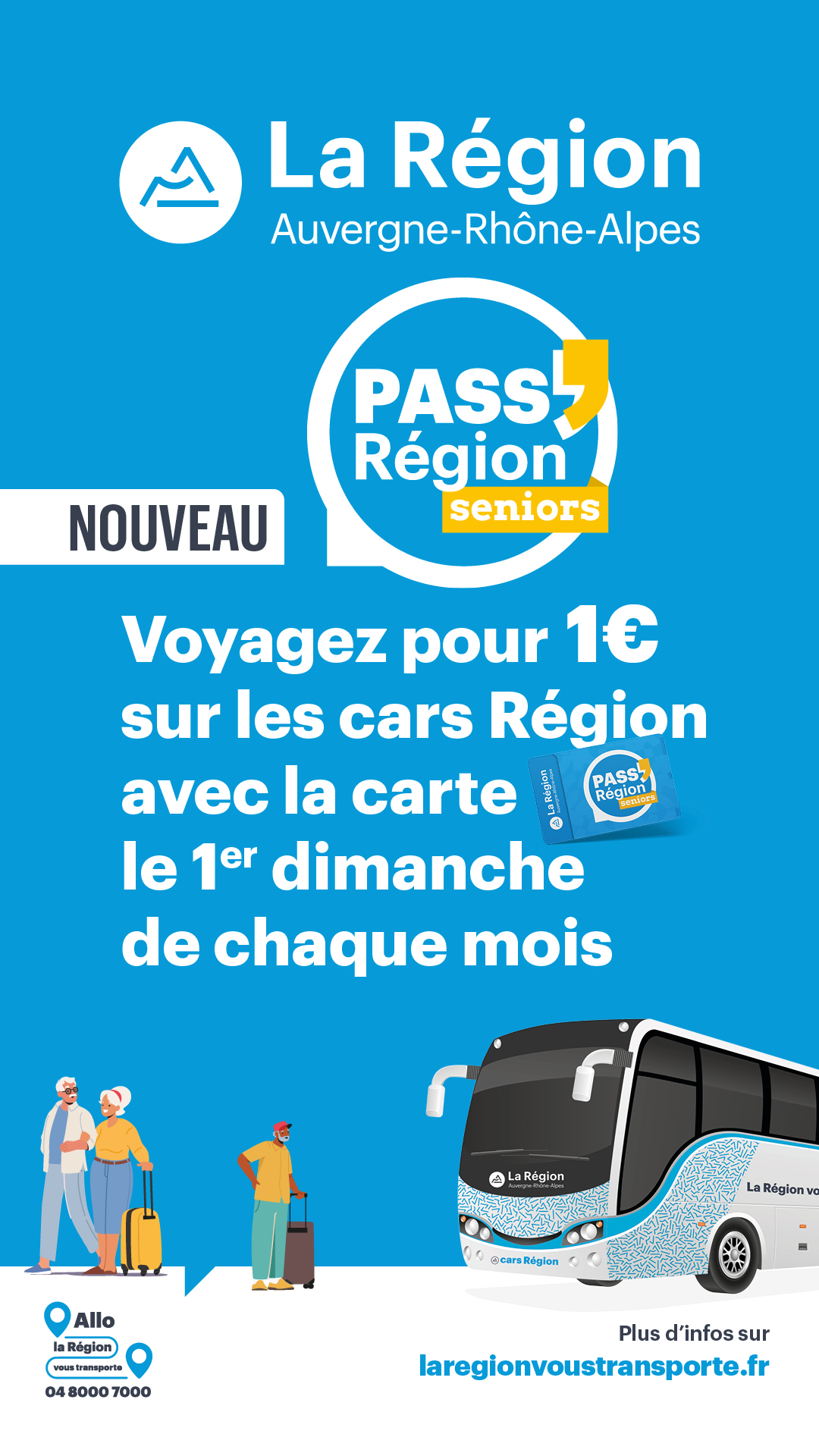 À partir du 1er février, tous les cars Région (hors lignes touristiques) accepteront la carte Pass Senior, disponible gratuitement auprès de la Région Auvergne-Rhône-Alpes. Destinée aux personnes de plus de 65 ans, cette carte propose des réductions chez de nombreux partenaires et permettra également de voyager à bord des cars Région pour 1 euro le trajet, chaque premier dimanche du mois.